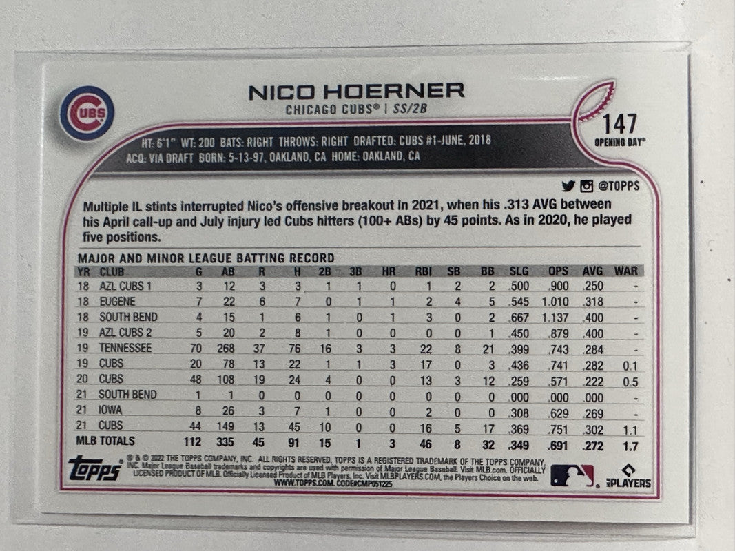 #147 Nico Hoerner Chicago Cubs 2022 Topps Opening Day Baseball Card