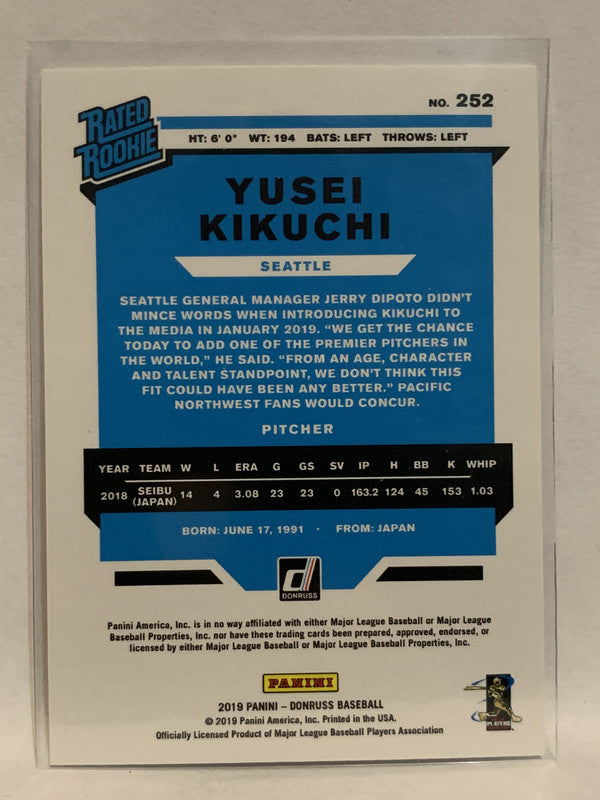#252 Yusei Kikuchi Rated Rookie Seattle Mariners 2019 Donruss Baseball Card