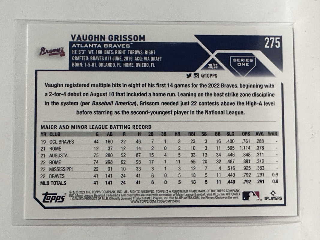 #275 Vaughn Grissom Rookie Atlanta Braves 2023 Topps Series One Baseball Card