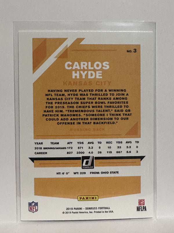 #3 Carlos Hyde Kansas City Chiefs 2019 Donruss Football Card