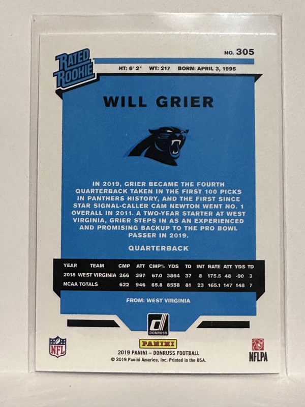 #305 Will Grier Rated Rookie Carolina Panthers 2019 Donruss Football Card