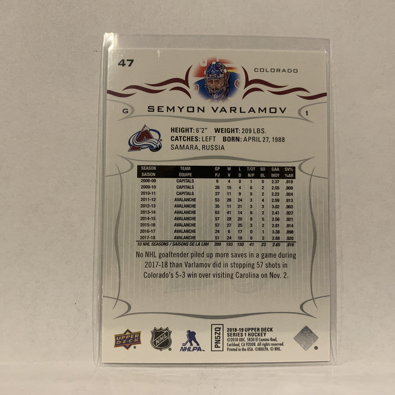 #47 Semyon Varlamov Colorado Avalanche Series 1 2018-19 Upper Deck Hockey Card A2V