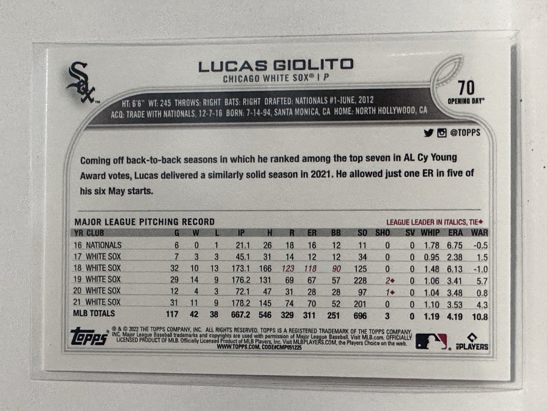 #70 Lucas Giolito Chicago White Sox 2022 Topps Opening Day Baseball Card