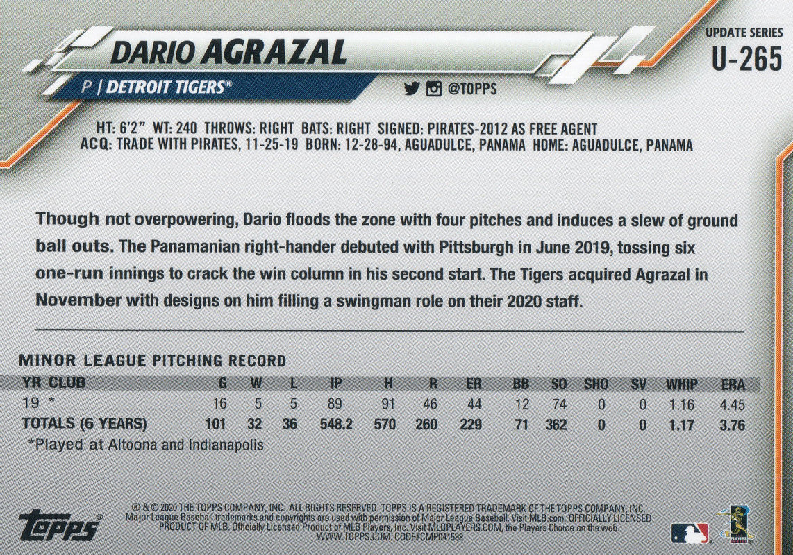 U-265 Dario Agrazal Rookie Detroit Tigers 2020 Topps Update Baseball Card